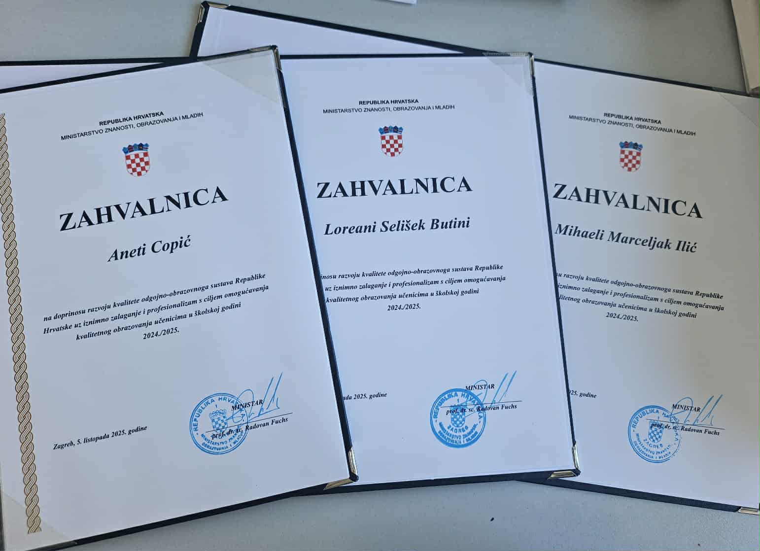 Ponosni smo objaviti da su nagradu za školsku godinu 2024. / 2025. među nagrađenm djelatnicima dobili i naši nastavnici: Aneta Copić, Mihaela Marceljak Ilić i Loreana Selišek Butina!