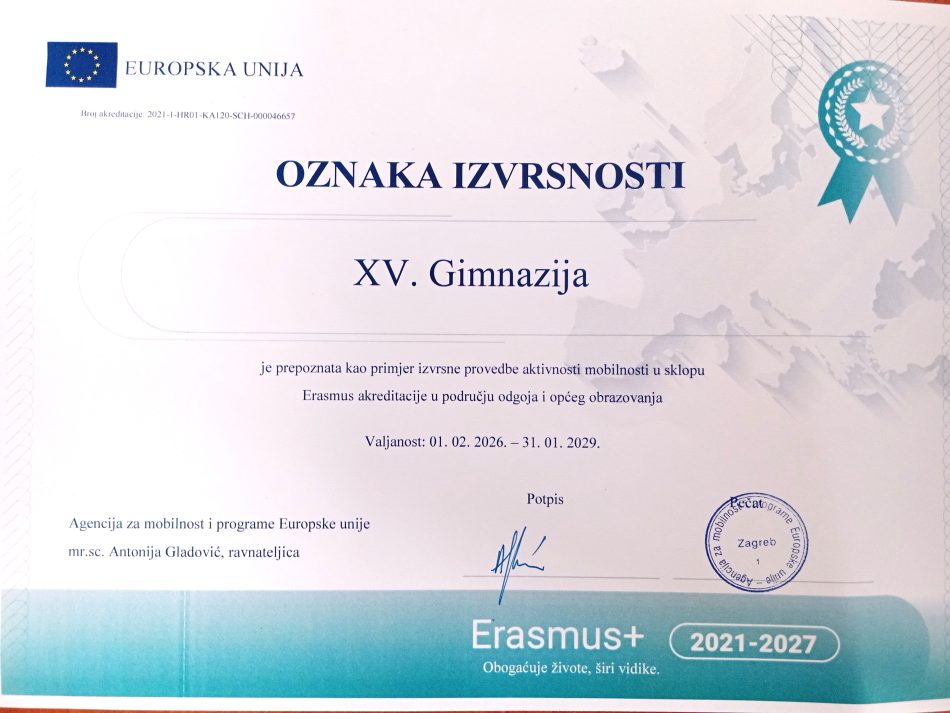 Agencija za mobilnost i programe Europske unije dodijelila je XV. gimnaziji OZNAKU IZVRSNOSTI za provedbe aktivnosti mobilnosti u sklopu Erasmus akreditacije u području odgoja i općeg obrazovanja.