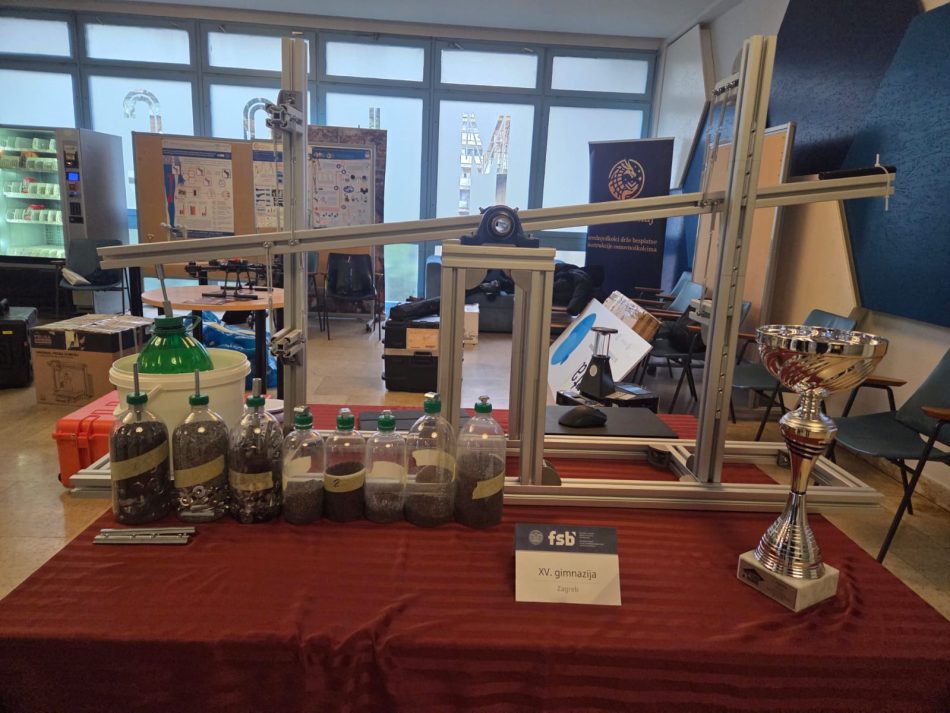 Svoj projekt predstavili su i učenici XV. gimnazije koji su izložili konstrukciju izrađenu u sklopu natjecanja FSB4School, na kojem su pred stručnim žirijem testirali mjerne sustave koje su samostalno projektirali i izradili. Tijekom eksperimentalnih zadataka koji su uključivali rad s oprugama, plovcima i tekućinama različitih gustoća morali su pokazati preciznost proračuna i stabilnost konstrukcije. Konstrukcija koja je osvojila prvo mjesto bila je izložena na štandu uz pehar, a naši su je učenici Luka Budimir, Jana Krajnović, Karlo Krstulović, Harun Morankić, Antonio Šimić I Domagoj Zorić s posebnim ponosom predstavili posjetiteljima.